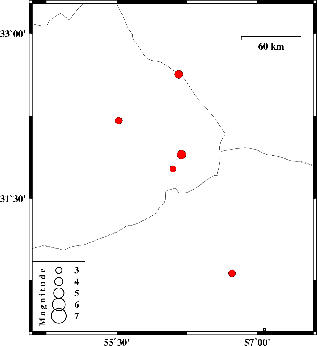 | 2007/05/03 | 00:03:23.1 | 03:33:23.1 | 32.21 | 55.52 | 14 | ML:3.4 | 68 km North-East of Bafq, Yazd Province | ||
