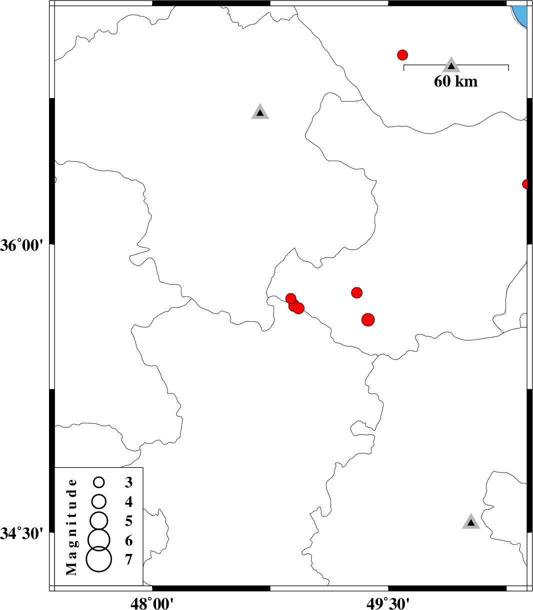 | 2007/04/02 | 15:53:16.6 | 19:23:16.6 | 35.69 | 48.9 | 14 | ML:2.9 | 36 km North-West of Razan, Hamedan Province | ||