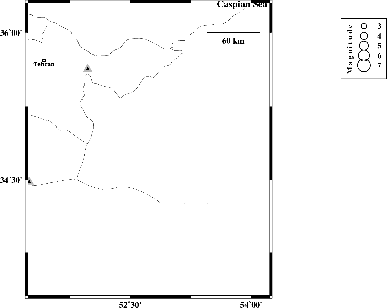 | 2007/06/19 | 23:05:34.2 | 02:35:34.2 | 34.8 | 52.76 | 14 | ML:3.2 | 60 km South-East of Garmsar, Semnan Province | ||
