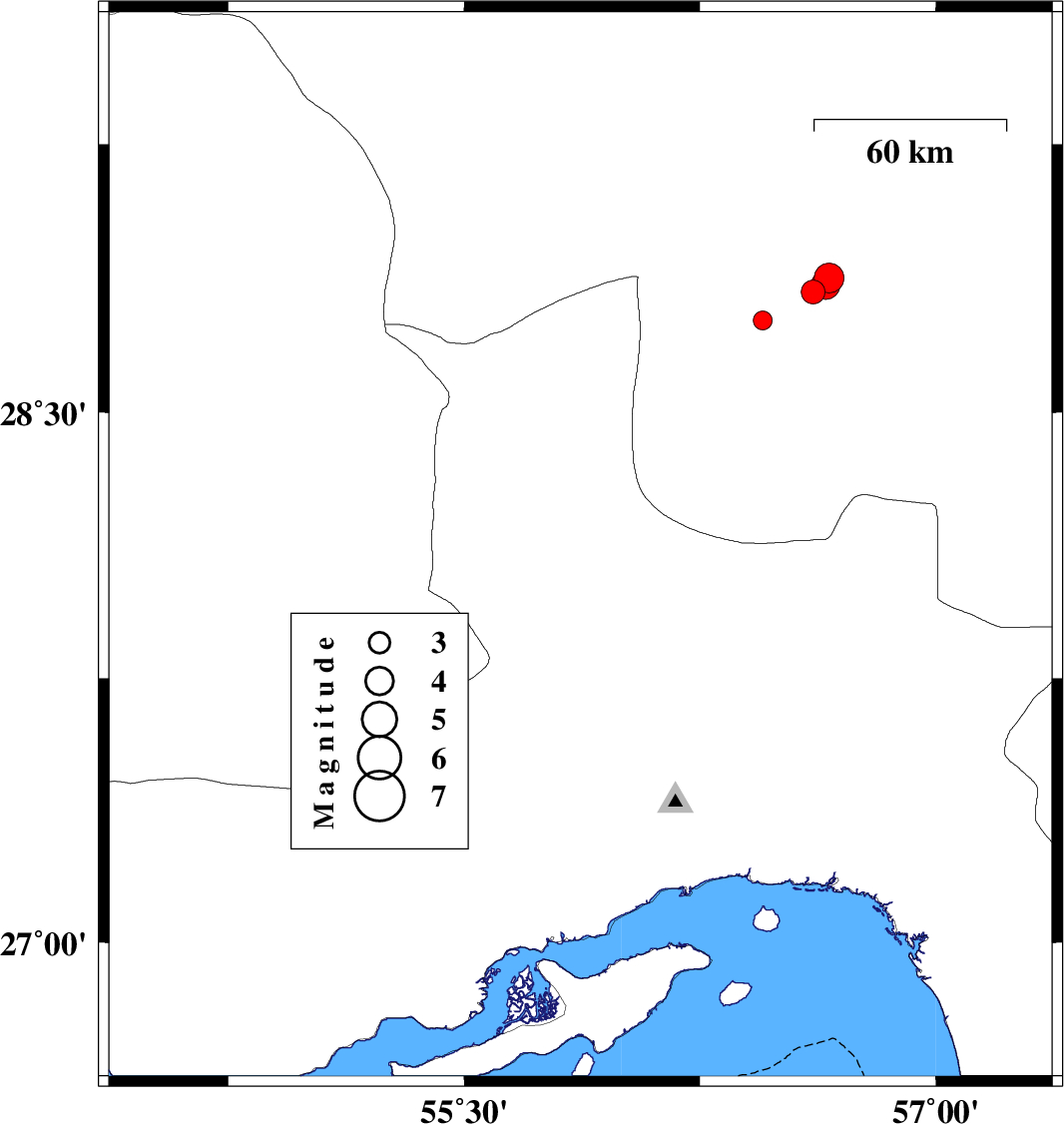 | 2007/05/12 | 08:17:27.5 | 11:47:27.5 | 27.08 | 54.63 | 46 | ML:3.5 | 29 km South-East of Bastak, Hormozgan Province |