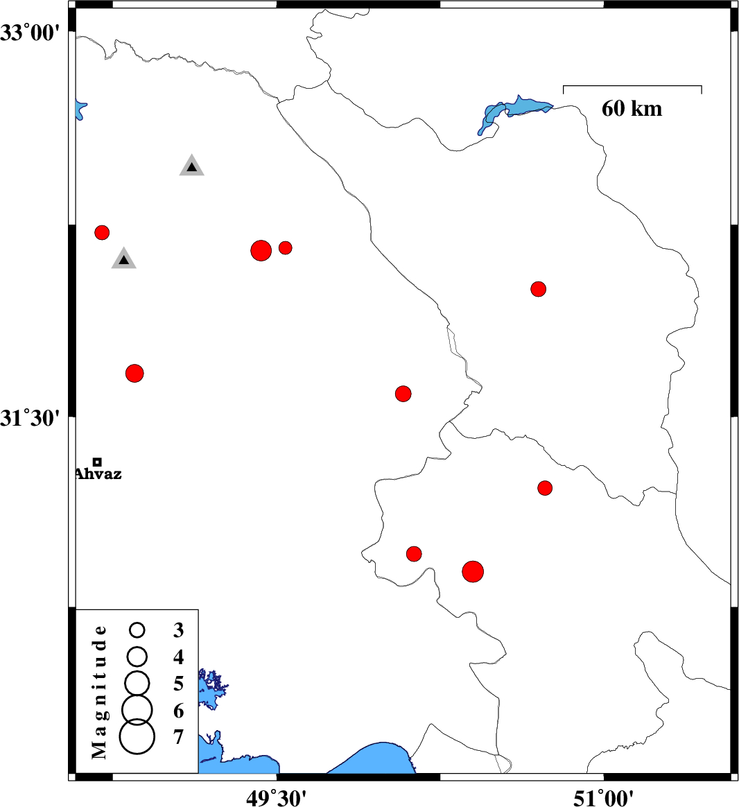 | 2007/03/29 | 10:20:44.6 | 13:50:44.6 | 32.16 | 49.54 | 14 | ML:2.7 | 33 km North-East of Masjed Soleyman, Khoozestan Province | ||