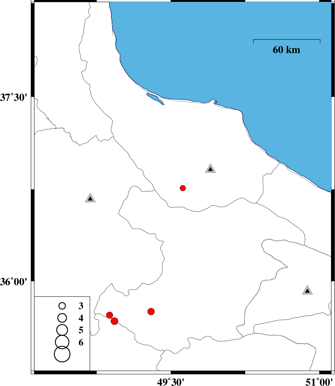 | 2007/04/21 | 08:47:31.8 | 12:17:31.8 | 36.76 | 49.62 | 14 | ML:2.6 | 18 km East of Rudbar, Gilan Province | ||