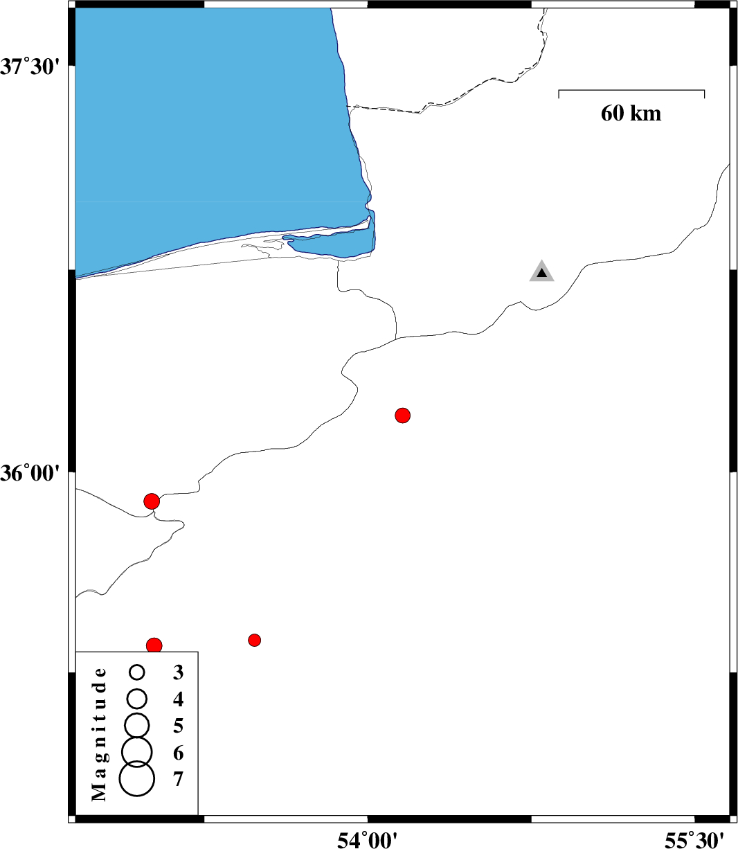 | 2007/04/03 | 22:27:37.3 | 01:57:37.3 | 35.89 | 53.01 | 17 | ML:3.2 | 24 km South of Pol-E-Sefid, Mazandaran Province |