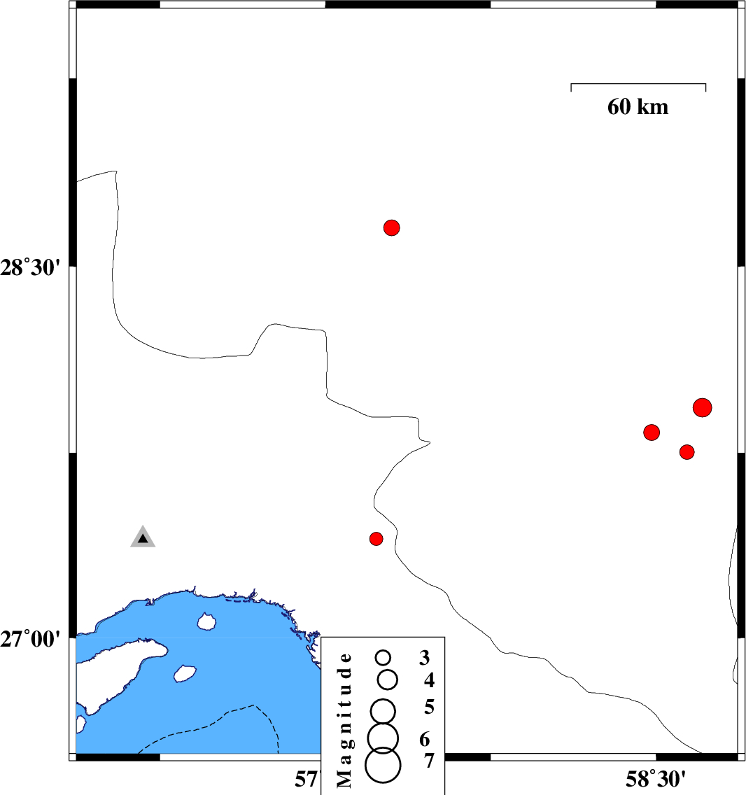 | 2007/04/21 | 15:32:13.7 | 19:02:13.7 | 28.13 | 57.6 | 15 | ML:3.8 | 22 km North of Kahnuj, Kerman Province | ||