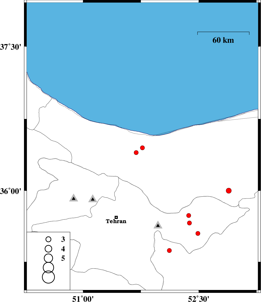 | 2007/04/29 | 05:36:09.7 | 09:06:09.7 | 35.74 | 52.37 | 6 | ML:2.6 | 27 km East of Damavand, Tehran Province | ||