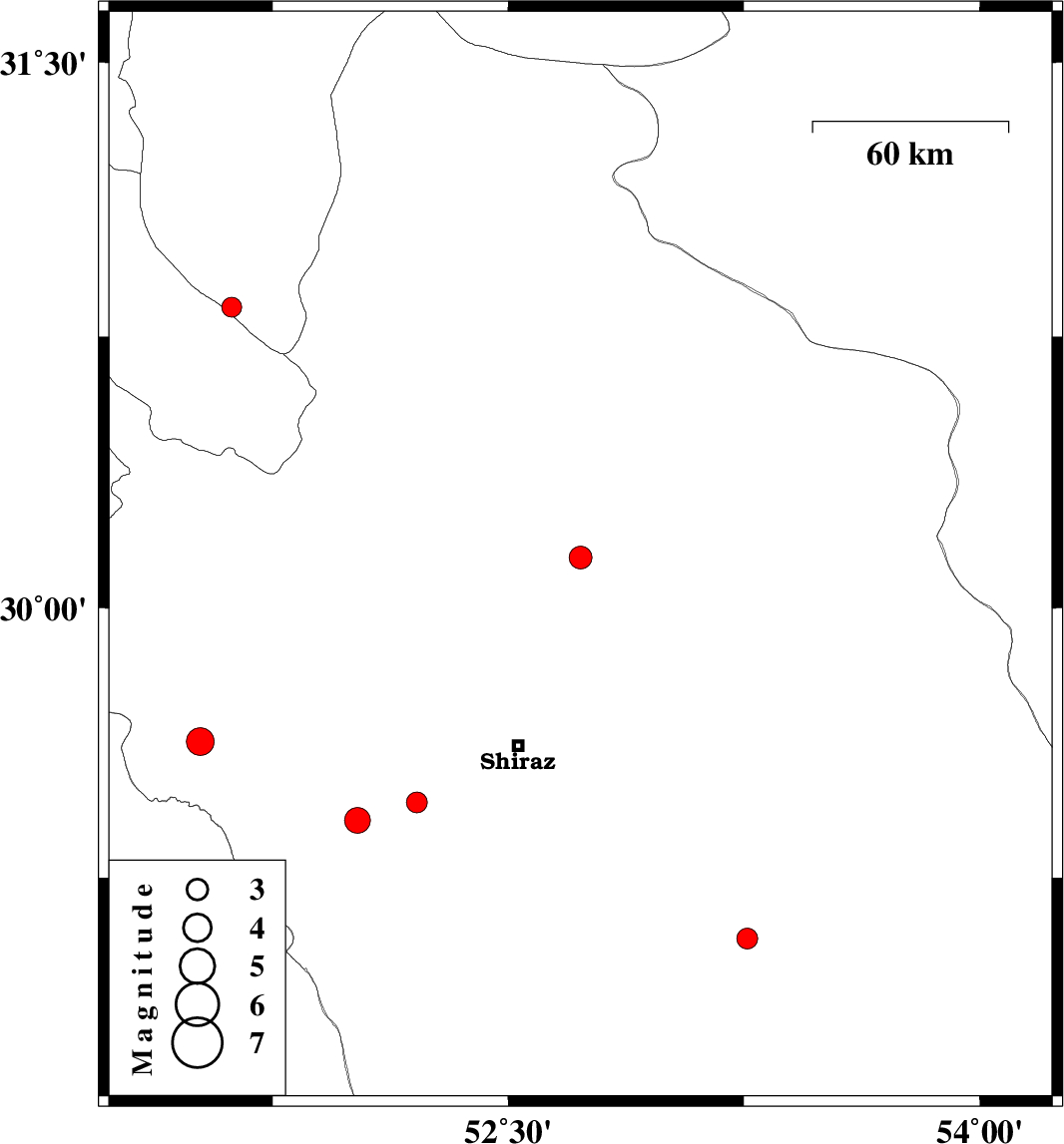 | 2007/04/17 | 12:20:39.4 | 15:50:39.4 | 29.46 | 52.21 | 18 | ML:3 | 35 km South-West of Shiraz, Fars Province | ||