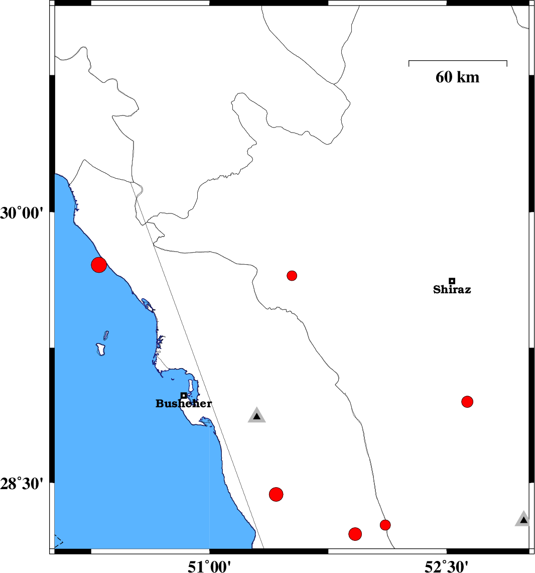 | 2007/04/23 | 11:36:29.4 | 15:06:29.4 | 29.63 | 51.52 | 15 | ML:3.9 | 13 km West of Kazerun, Fars Province | ||