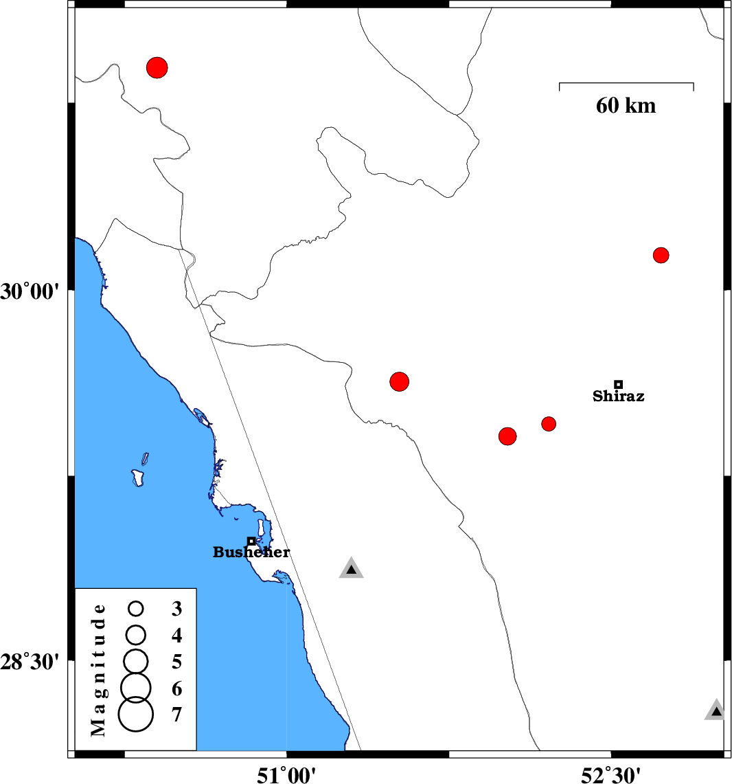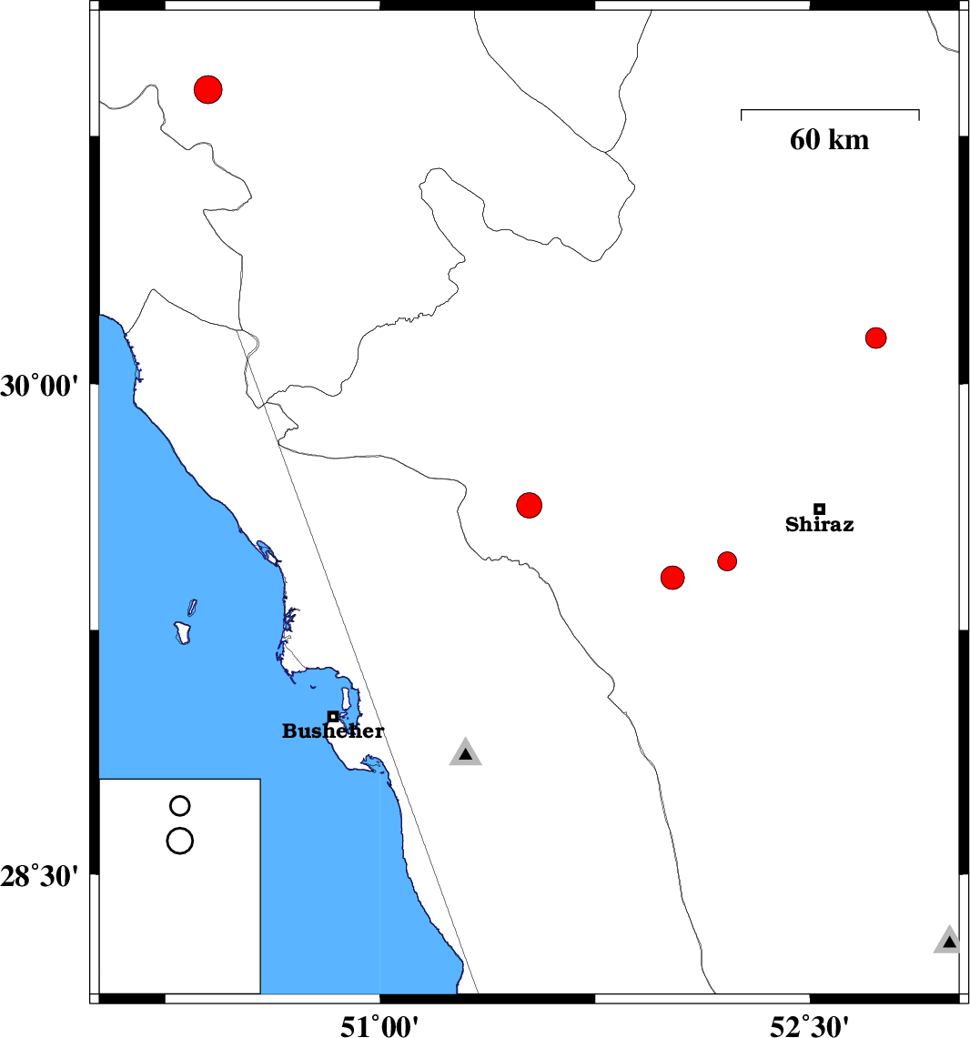 | 2007/04/17 | 12:20:39.4 | 15:50:39.4 | 29.46 | 52.21 | 18 | ML:3 | 35 km South-West of Shiraz, Fars Province |