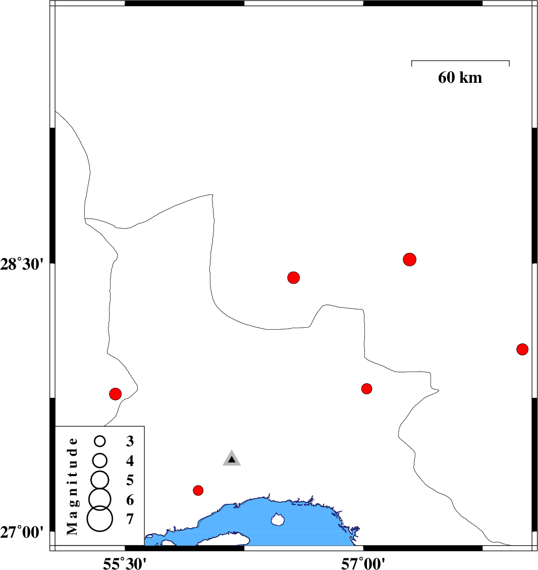 | 2007/06/04 | 18:34:11.2 | 22:04:11.2 | 27.47 | 55.29 | 14 | ML:3.3 | 95 km North-East of Bastak, Hormozgan Province | ||