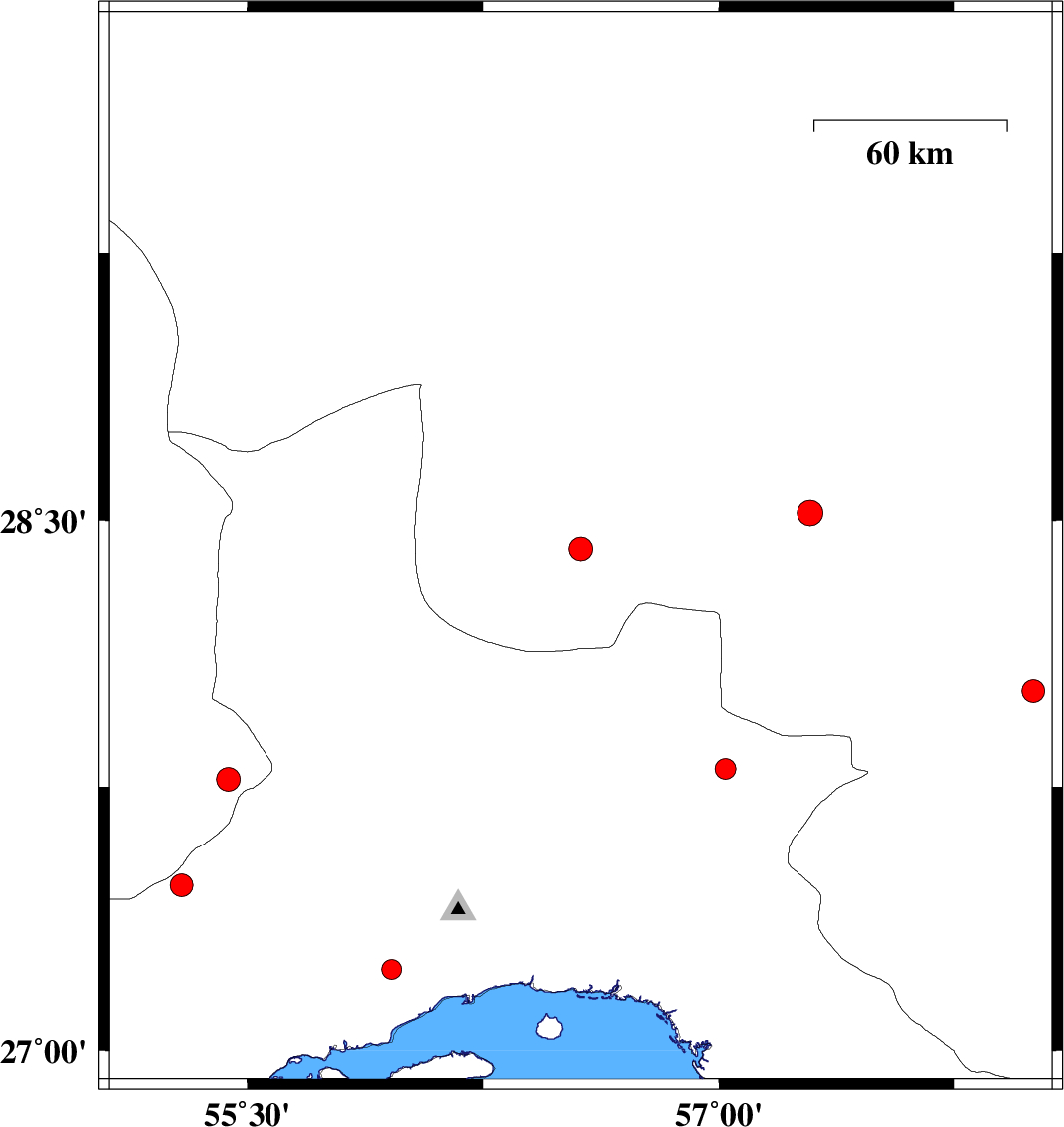 | 2007/05/24 | 00:50:42.3 | 04:20:42.3 | 27.23 | 55.96 | 40 | ML:2.8 | 32 km West of Bandar-e abbas, Hormozgan Province |