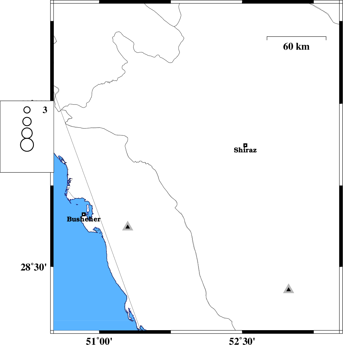 | 2007/04/23 | 12:12:04.1 | 15:42:04.1 | 29.41 | 52.02 | 14 | ML:3.6 | 42 km South-East of Kazerun, Fars Province | ||