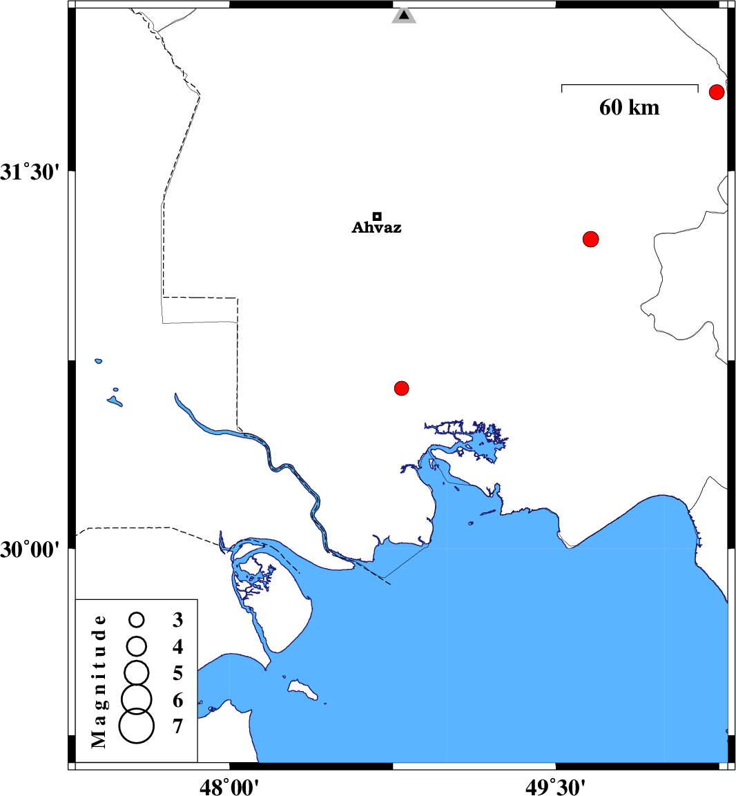 | 2007/05/17 | 21:02:48.2 | 00:32:48.2 | 31.23 | 49.66 | 14 | ML:3.3 | 6 km Ramhormoz, Khoozestan Province |