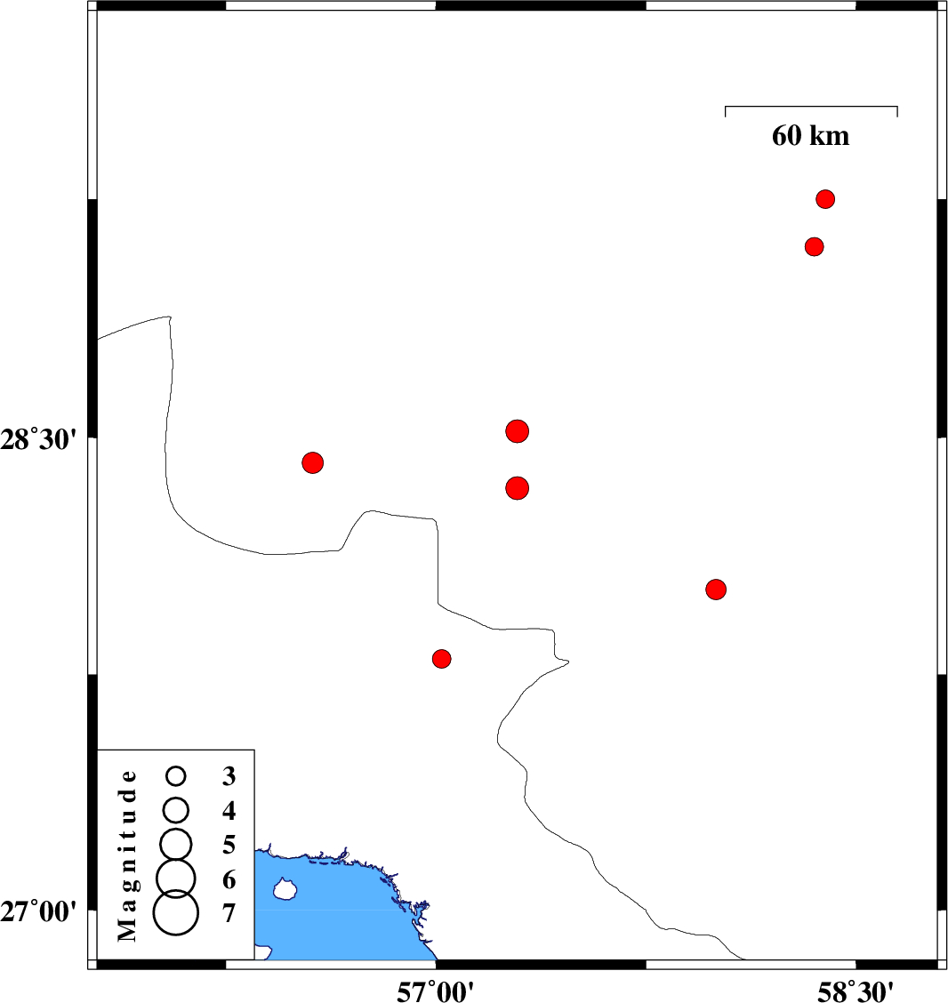 | 2007/06/22 | 22:07:33.4 | 01:37:33.4 | 27.8 | 57.02 | 14 | ML:3 | 47 km North-West of Dehbarez, Hormozgan Province | ||