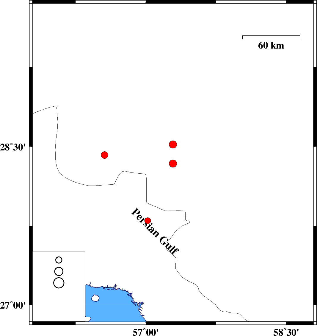 | 2007/06/22 | 22:07:33.4 | 01:37:33.4 | 27.8 | 57.02 | 14 | ML:3 | 47 km North-West of Dehbarez, Hormozgan Province | ||