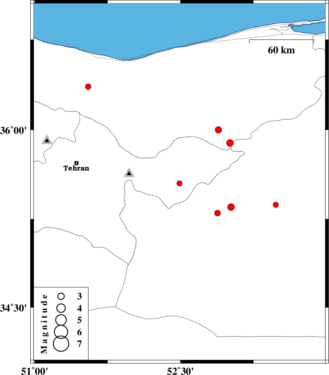 | 2007/04/19 | 23:01:02.9 | 02:31:02.9 | 35.37 | 53.48 | 14 | ML:2.6 | 23 km South of Semnan, Semnan Province | ||