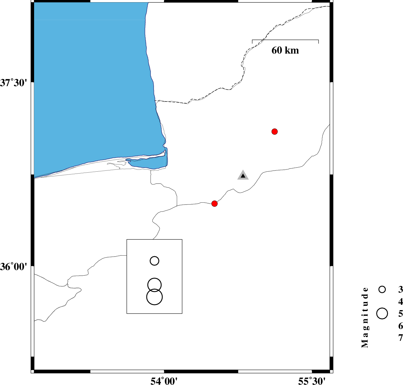 | 2007/05/27 | 04:39:29.4 | 08:09:29.4 | 36.64 | 54.18 | 15 | ML:2.7 | 18 km South of Kordkuy, Golestan Province | ||