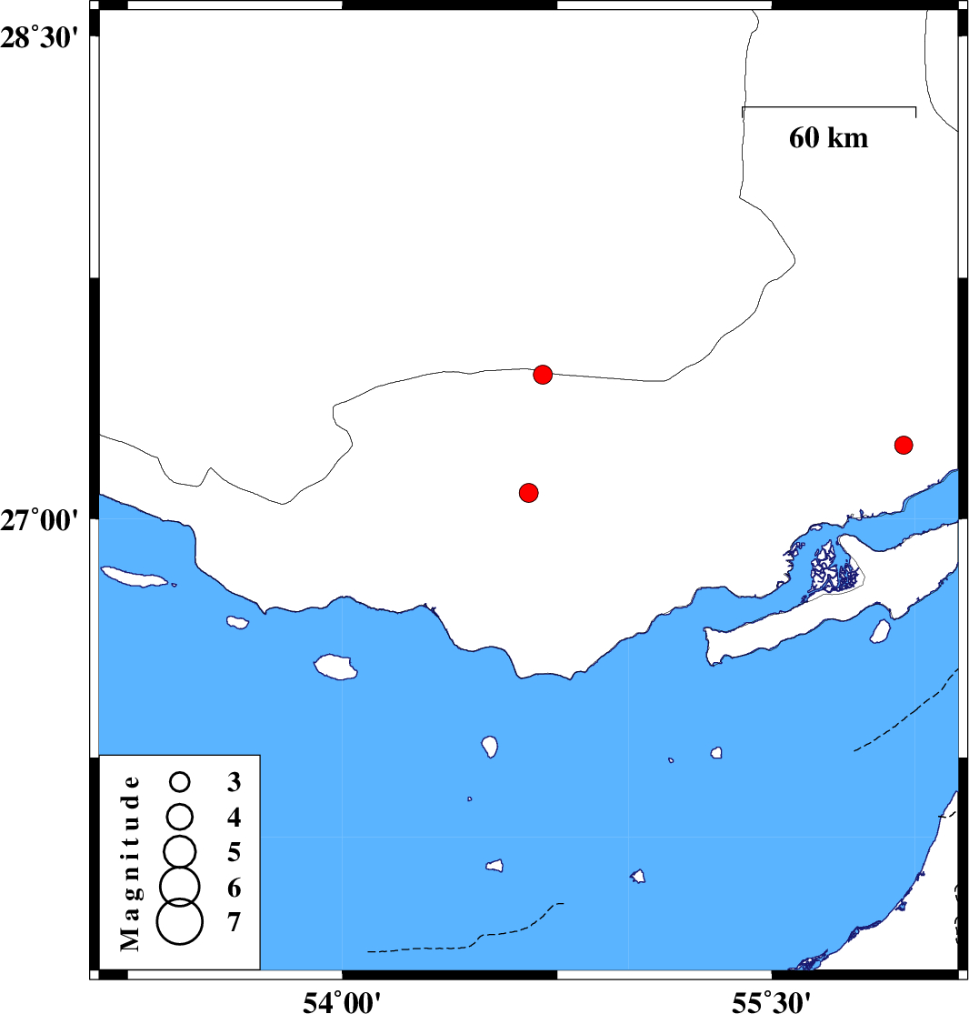 | 2007/05/27 | 08:08:22.9 | 11:38:22.9 | 27.08 | 54.65 | 46 | ML:2.9 | 31 km South-East of Bastak, Hormozgan Province | ||