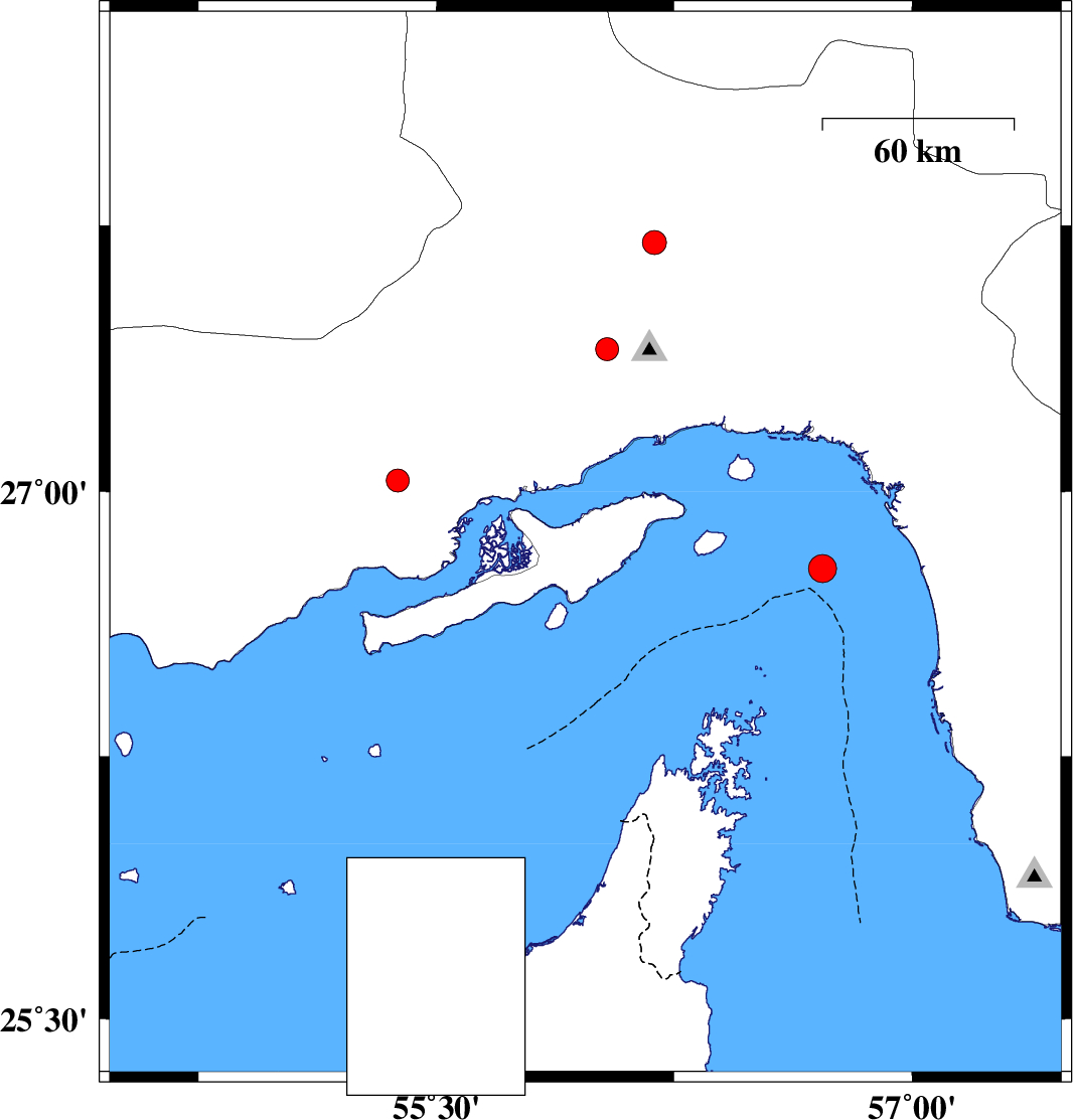 | 2007/06/27 | 19:08:16.9 | 22:38:16.9 | 26.85 | 55.97 | 17 | ML:3.9 | Persian Gulf, 31 km South-West of Qeshm | ||