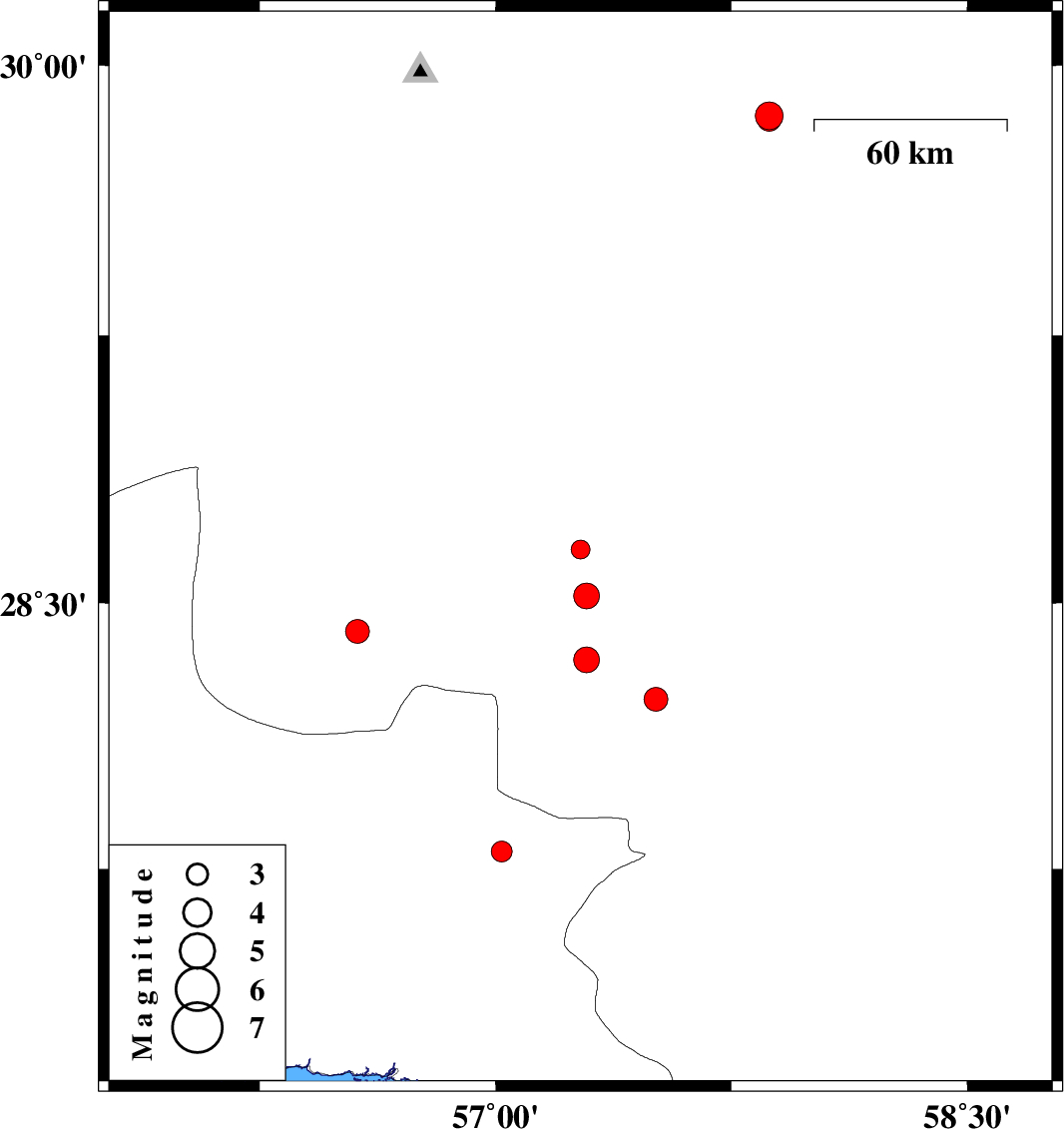 | 2007/06/28 | 13:05:37.3 | 16:35:37.3 | 29.86 | 57.87 | 14 | ML:3.9 | 89 km South-East of Kerman, Kerman Province | ||
