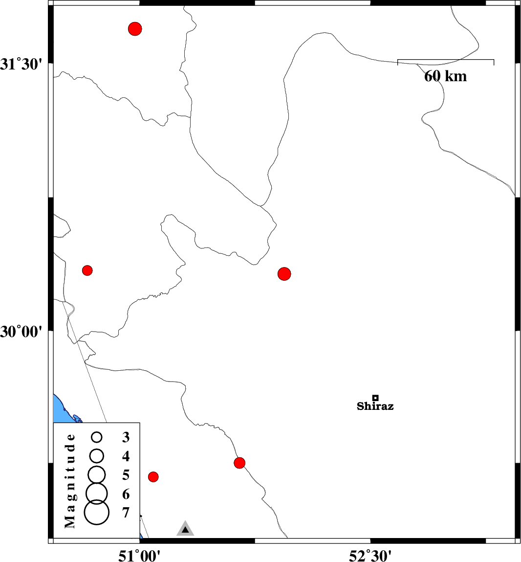 | 2007/05/01 | 14:40:24.8 | 18:10:24.8 | 29.25 | 51.65 | 18 | ML:3.2 | 41 km South of Kazerun, Fars Province |