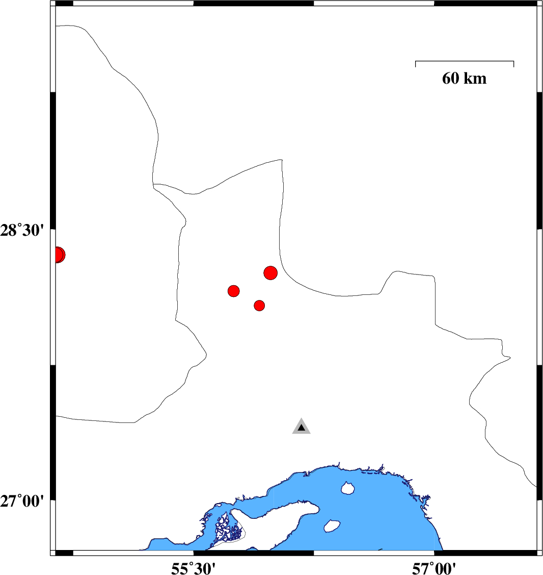 2007/04/21 15:34:32.6 19:04:32.6 27.9557.5315 ML:3 15 km West of Kahnuj, Kerman Province