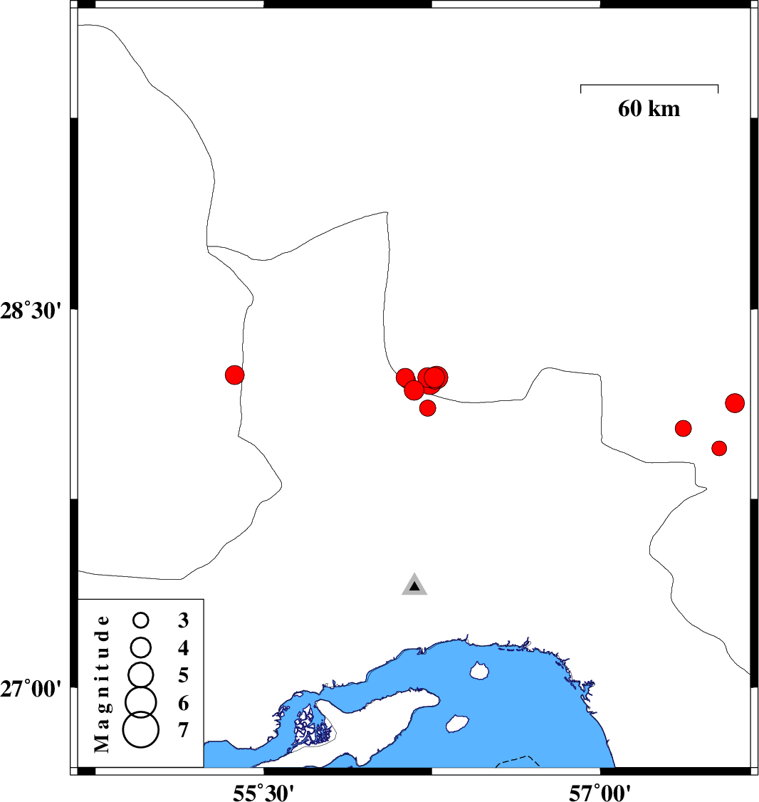 2007/04/28 21:22:55.9 00:52:55.9 28.1856.1714 ML:4 29 km South-East of Hajiabad, Hormozgan Province