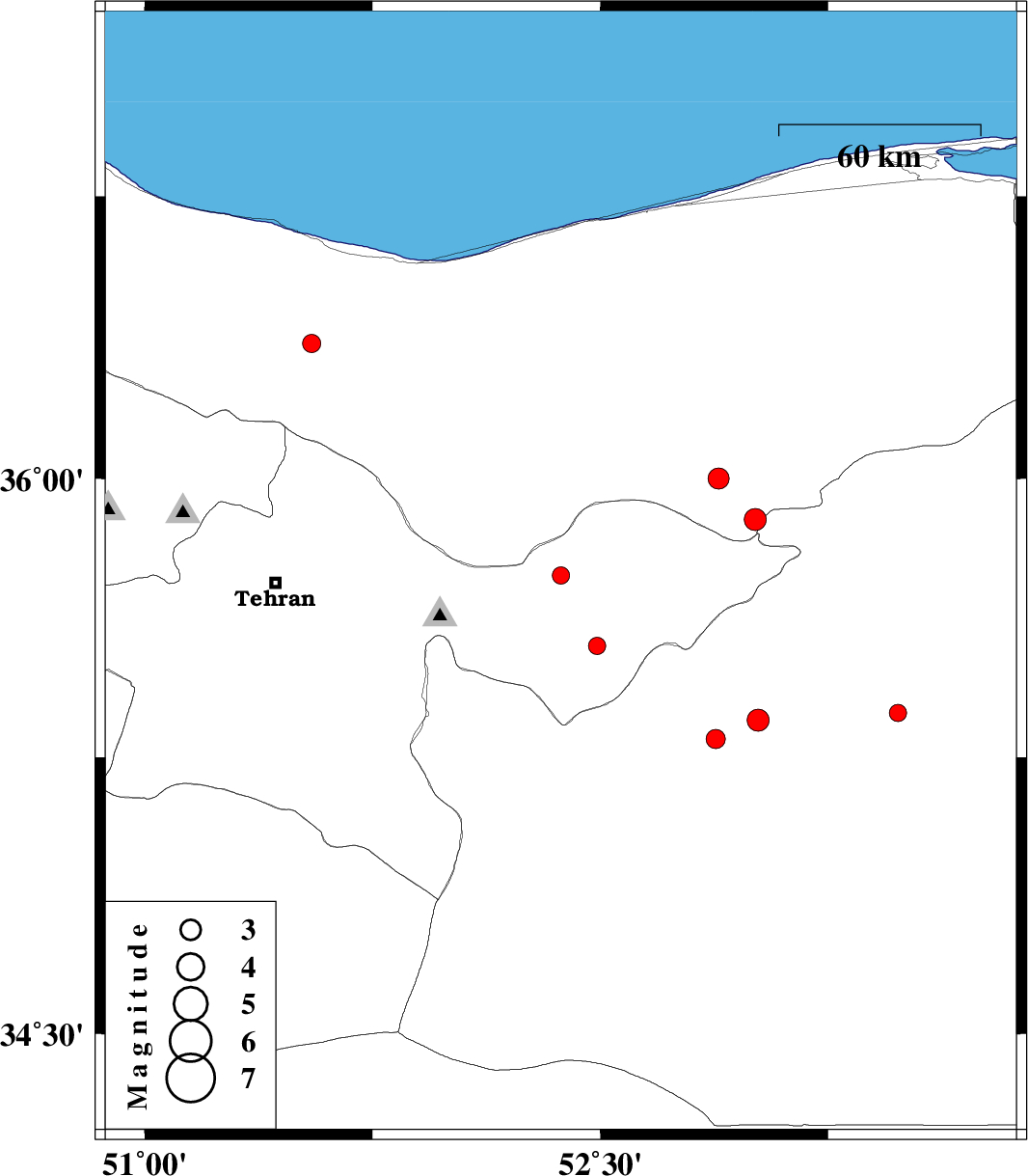 | 2007/04/29 | 05:36:09.7 | 09:06:09.7 | 35.74 | 52.37 | 6 | ML:2.6 | 27 km East of Damavand, Tehran Province | ||