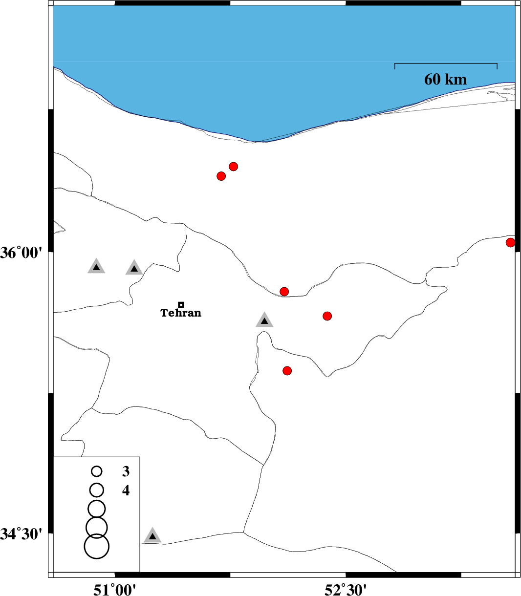 | 2007/05/30 | 09:44:10.4 | 13:14:10.4 | 35.79 | 52.1 | 12 | ML:2.6 | 8 km Damavand, Tehran Province | ||
