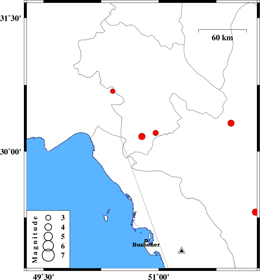 | 2007/05/24 | 20:16:29.3 | 23:46:29.3 | 30.68 | 50.4 | 15 | ML:2.8 | 17 km East of Behbahan, Khoozestan Province |