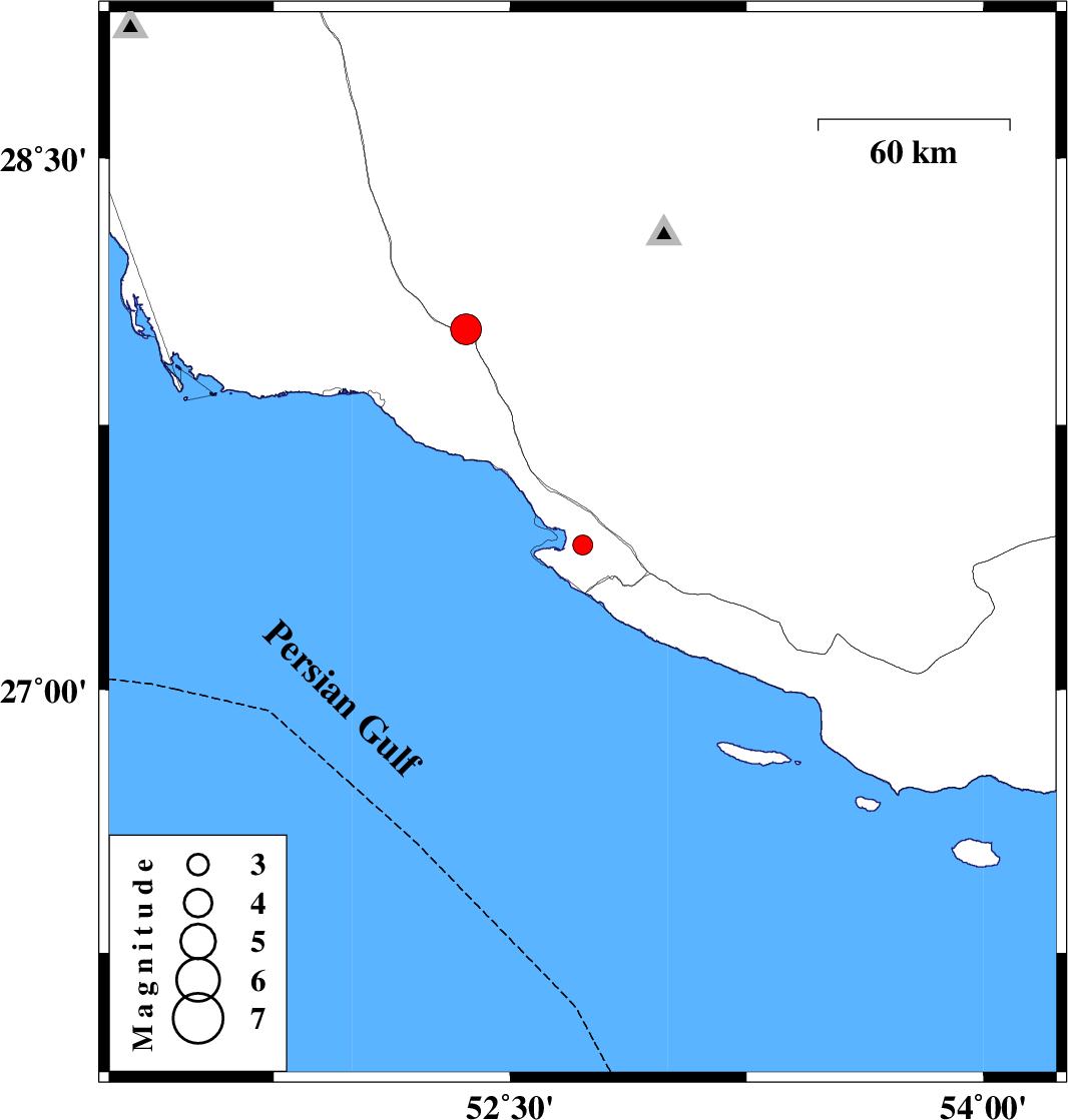 | 2007/05/24 | 21:51:37.9 | 01:21:37.9 | 28.02 | 52.36 | 18 | ML:4.4 | 21 km North of Jam, Bushehr Province |