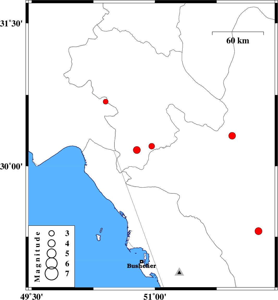 | 2007/05/24 | 20:16:29.3 | 23:46:29.3 | 30.68 | 50.4 | 15 | ML:2.8 | 17 km East of Behbahan, Khoozestan Province |