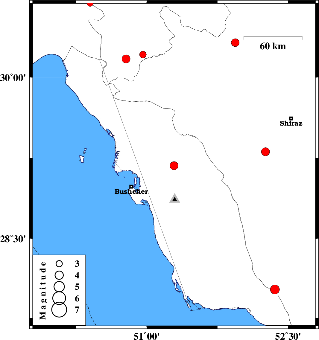 | 2007/05/29 | 06:18:57.2 | 09:48:57.2 | 29.31 | 52.26 | 46 | ML:4 | 43 km South-West of Shiraz, Fars Province | ||