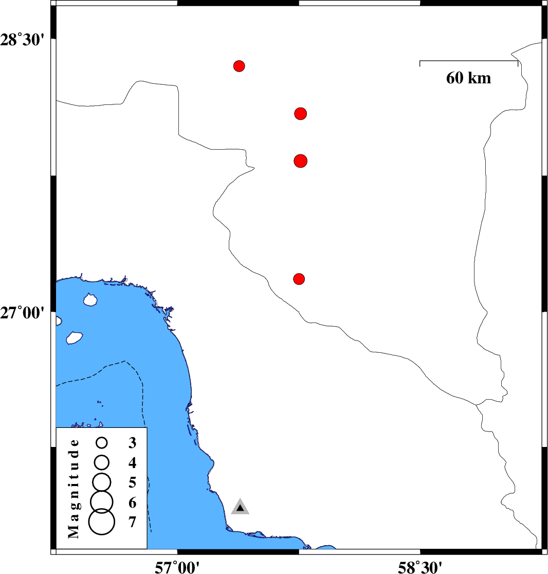 | 2007/07/31 | 11:04:19.6 | 14:34:19.6 | 27.83 | 57.76 | 14 | ML:3.6 | 14 km South of Kahnuj, Kerman Province | ||