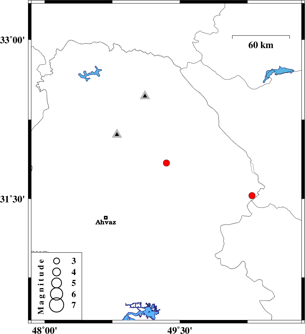 | 2007/07/26 | 22:55:29.8 | 02:25:29.8 | 31.53 | 50.3 | 14 | ML:3.3 | 37 km East of Bagh Malek, Khoozestan Province |
