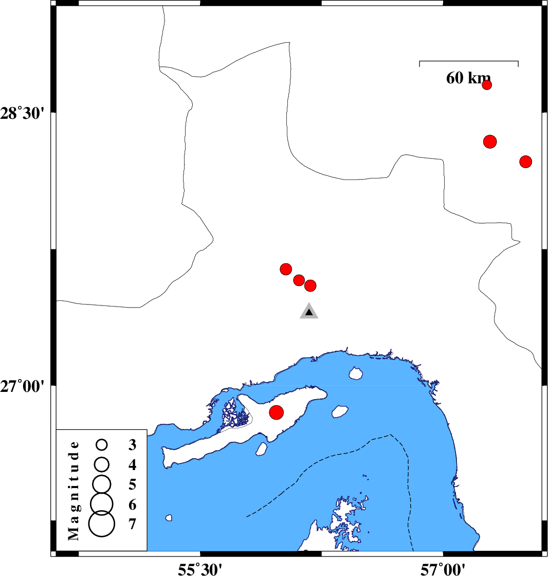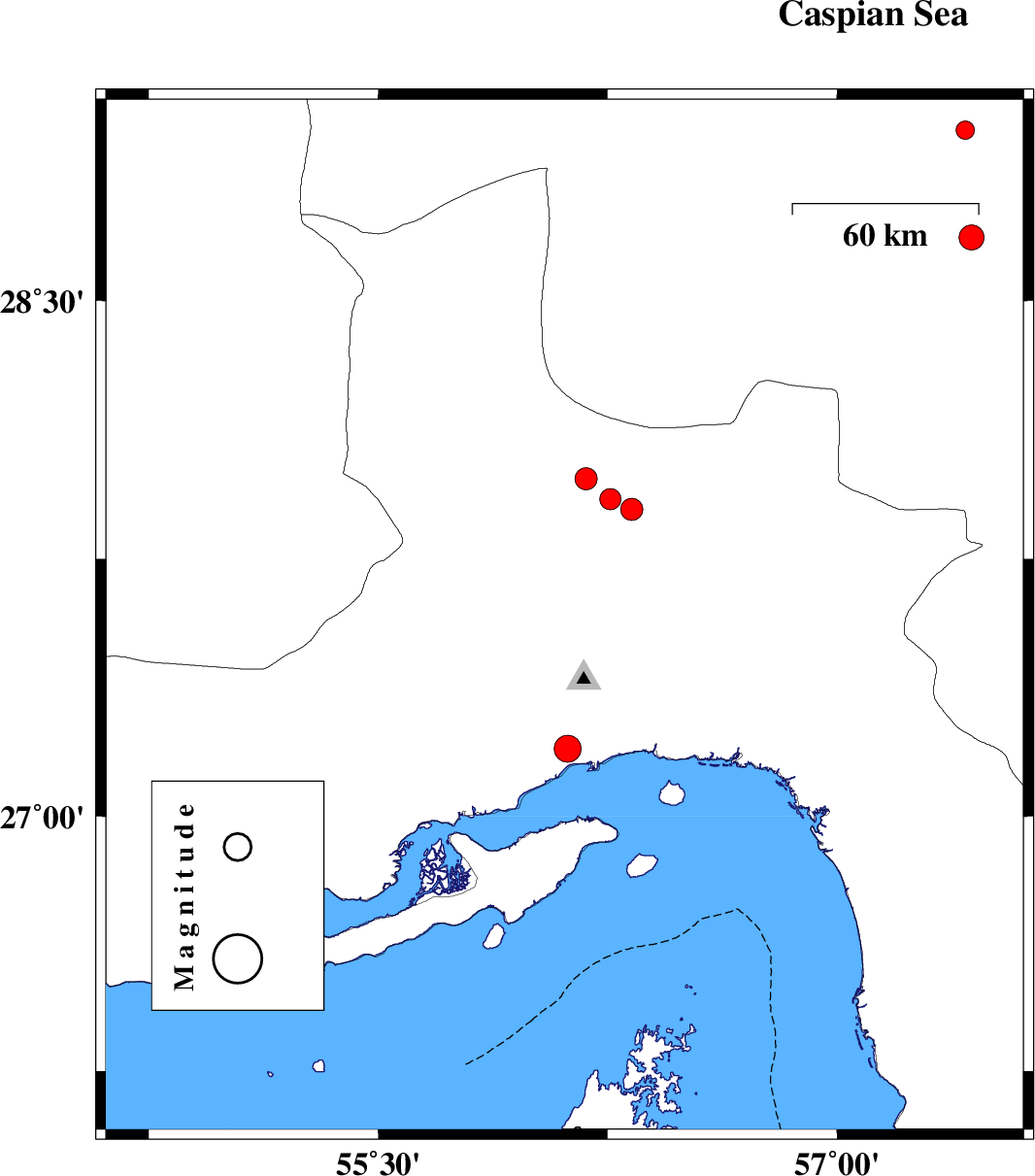 | 2007/06/27 | 19:08:16.9 | 22:38:16.9 | 26.85 | 55.97 | 17 | ML:3.9 | Persian Gulf, 31 km South-West of Qeshm | ||