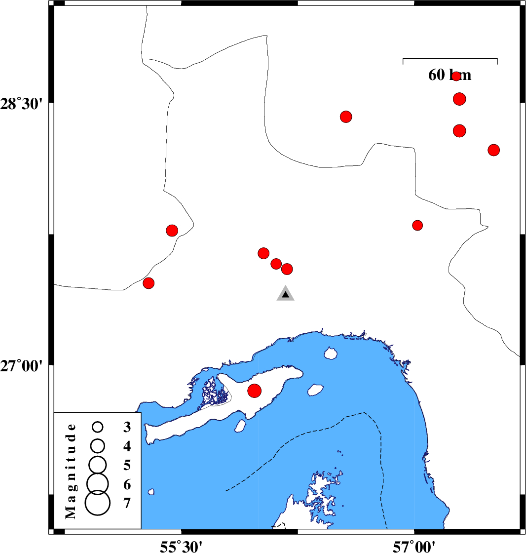 2007/06/22 22:07:33.4 01:37:33.4 27.857.0214 ML:3 47 km North-West of Dehbarez, Hormozgan Province