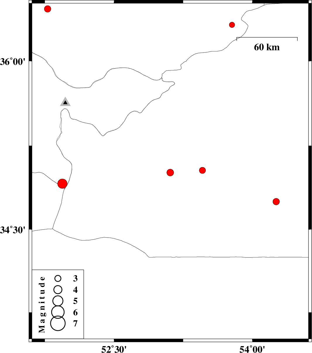 | 2007/08/25 | 10:07:35.3 | 13:37:35.3 | 34.91 | 51.94 | 24 | ML:4.6 | 50 km South-West of Garmsar, Semnan Province | ||