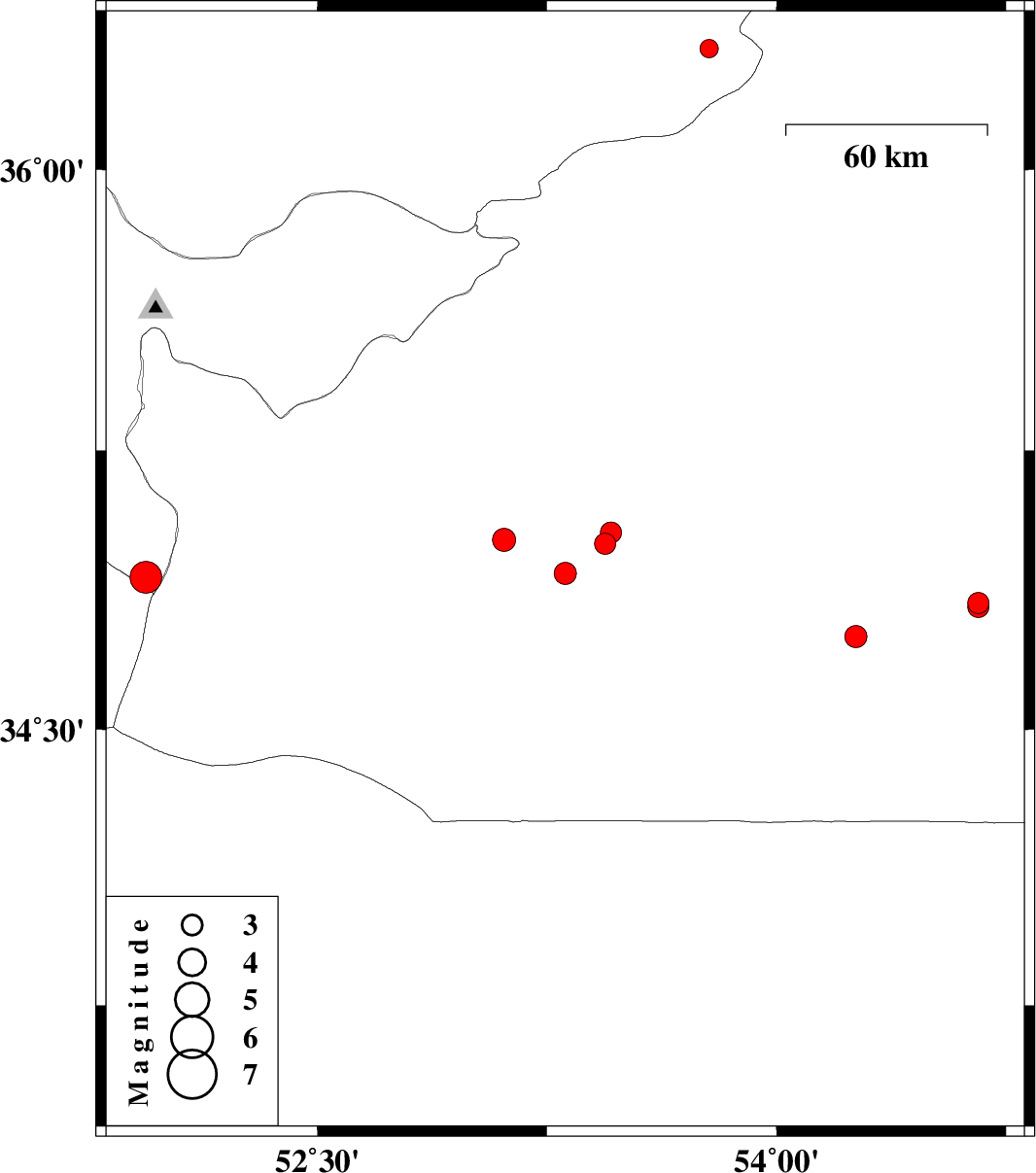 | 2007/09/04 | 16:15:36.6 | 19:45:36.6 | 35 | 53.44 | 14 | ML:3.1 | 63 km South of Semnan, Semnan Province | ||