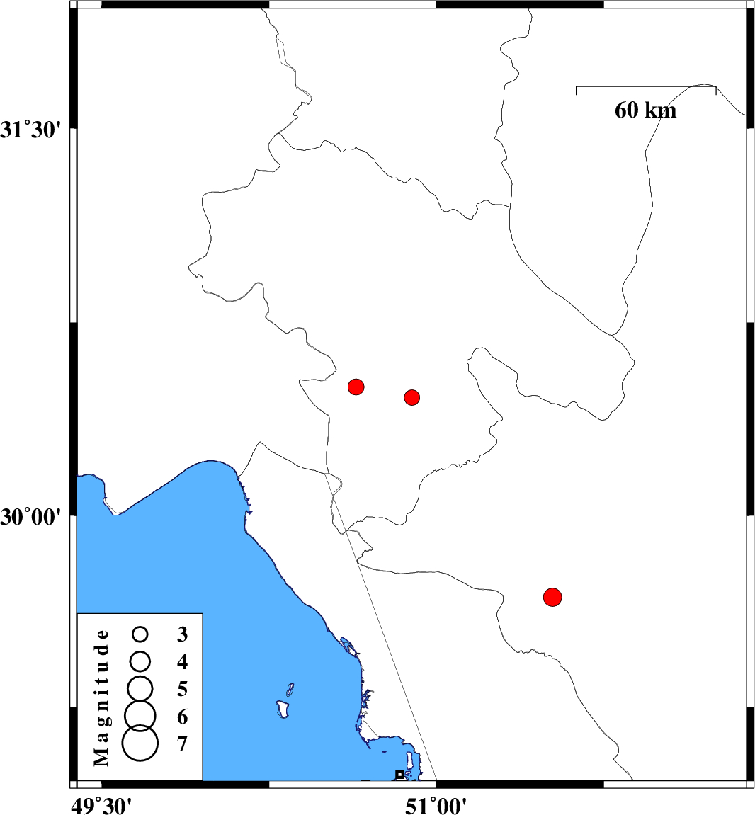 | 2007/06/27 | 00:08:50.3 | 03:38:50.3 | 29.68 | 51.52 | 14 | ML:3.6 | 14 km West of Kazerun, Fars Province |