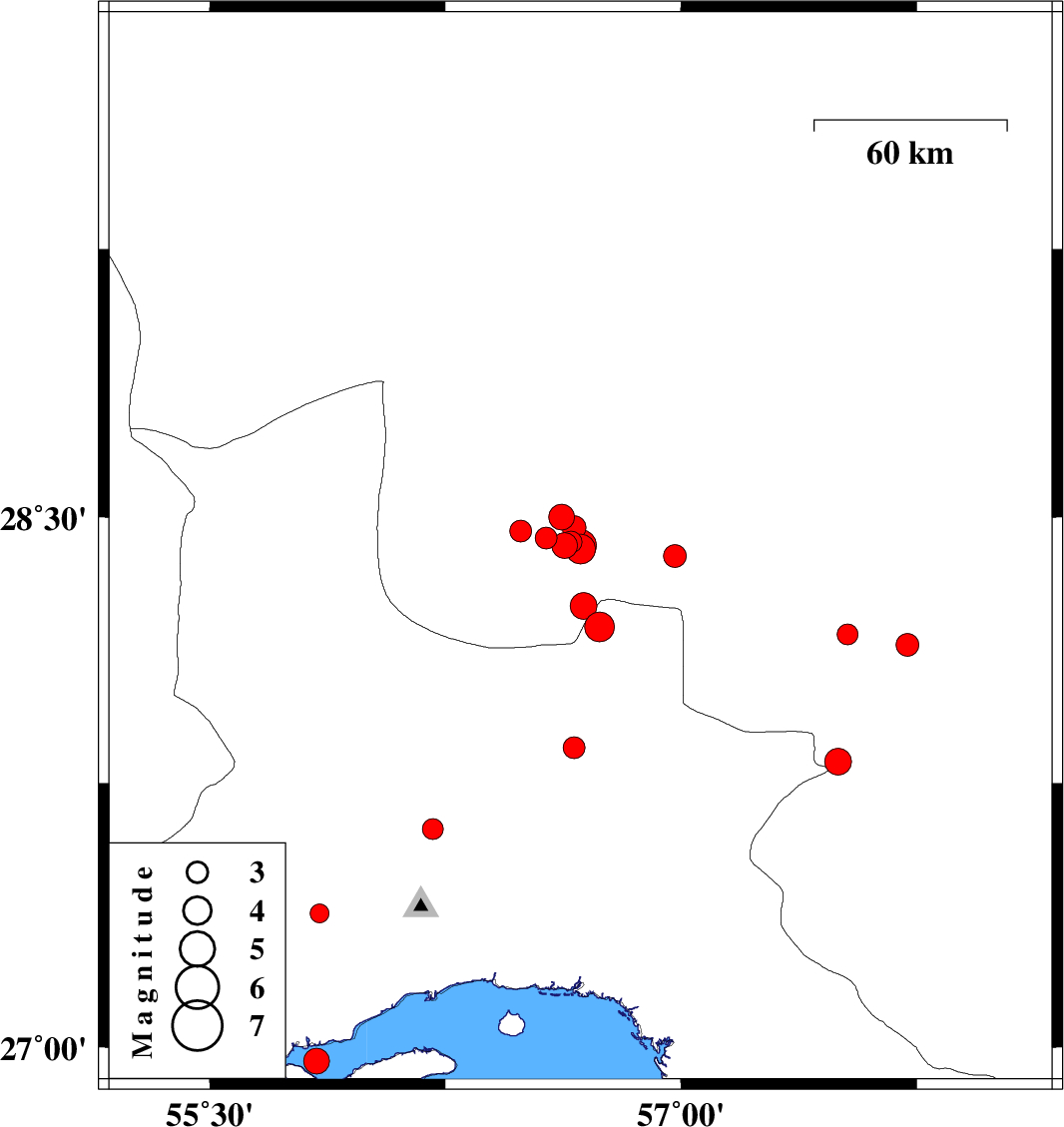 2007/08/28 08:30:09.3 12:00:09.3 28.2556.6915 ML:3.8 77 km East of Hajiabad, Hormozgan Province