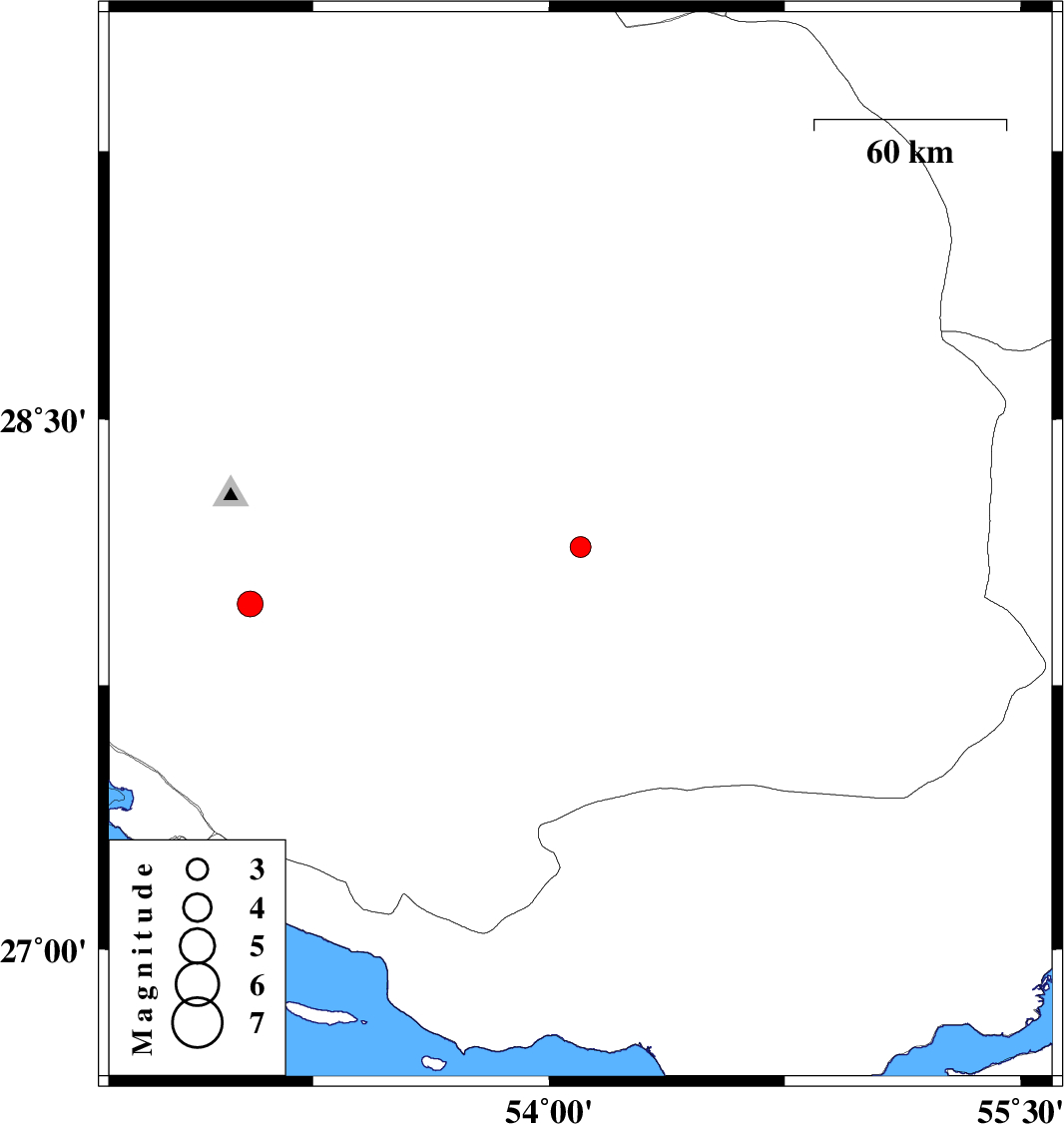 | 2007/09/05 | 02:05:32.7 | 05:35:32.7 | 27.98 | 53.05 | 18 | ML:3.6 | 50 km North-East of Mehr, Fars Province |