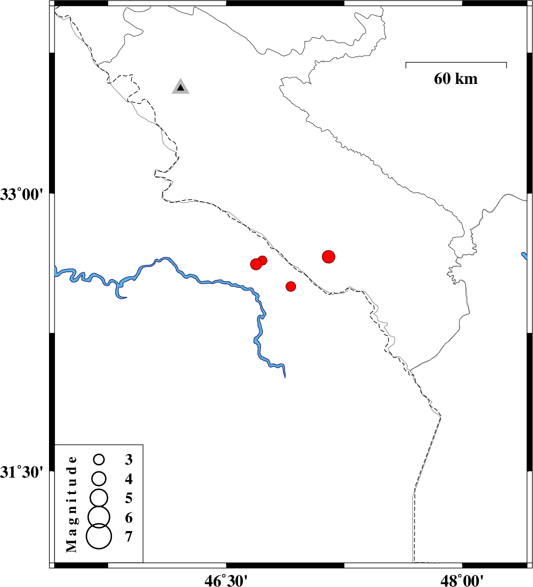 | 2007/07/03 | 08:29:02.2 | 11:59:02.2 | 32.64 | 46.73 | 18 | ML:2.7 | 50 km West of Dehloran, Ilam Province |
