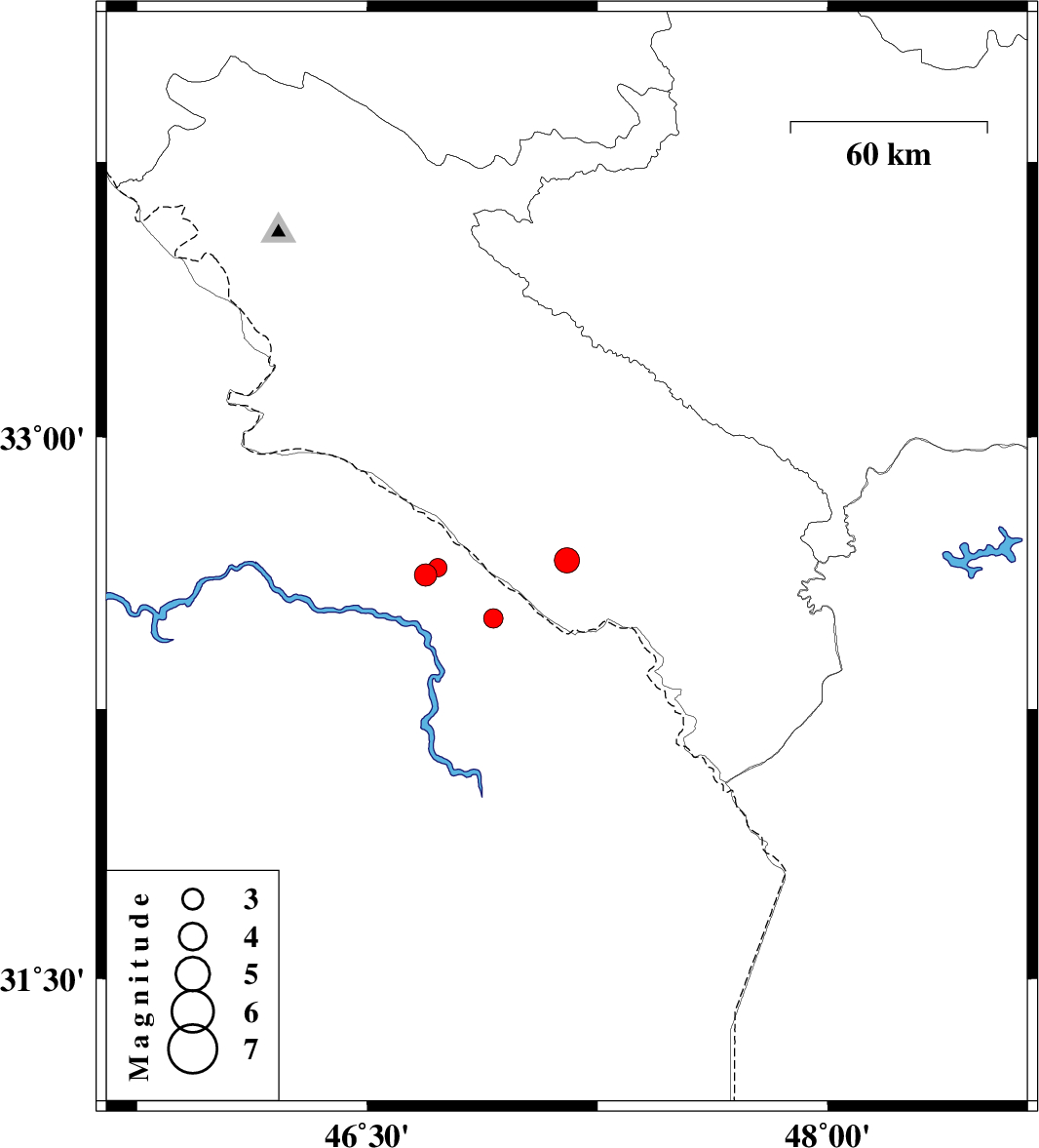 | 2007/07/03 | 08:29:02.2 | 11:59:02.2 | 32.64 | 46.73 | 18 | ML:2.7 | 50 km West of Dehloran, Ilam Province |