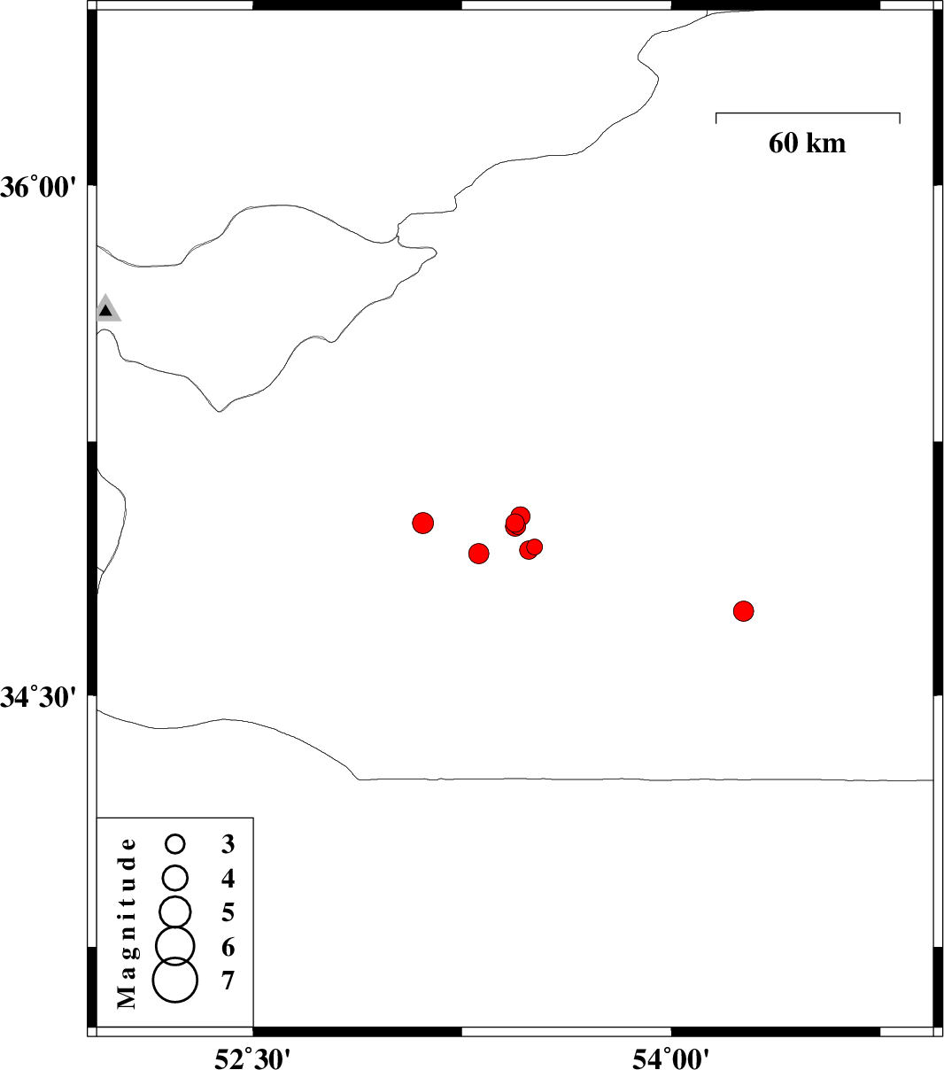 | 2007/09/05 | 17:52:35.7 | 21:22:35.7 | 34.94 | 53.51 | 14 | ML:2.6 | 70 km South-East of Semnan, Semnan Province | ||