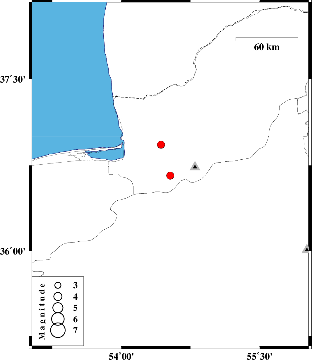 | 2007/09/06 | 09:54:30.8 | 13:24:30.8 | 36.93 | 54.43 | 14 | ML:3.6 | 9 km Aq Qaleh, Golestan Province |