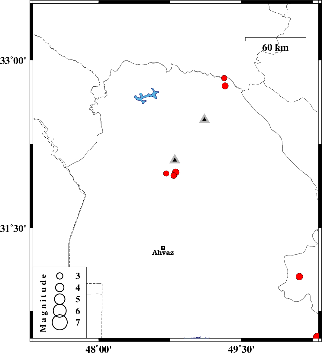 | 2007/09/10 | 21:18:57.1 | 00:48:57.1 | 31.99 | 48.71 | 4 | ML:2.7 | 14 km West of Shushtar, Khoozestan Province | ||