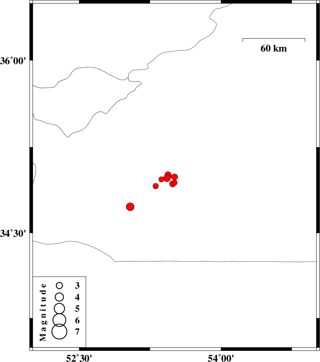 | 2007/09/05 | 14:02:47.7 | 17:32:47.7 | 34.93 | 53.49 | 14 | ML:3 | 71 km South of Semnan, Semnan Province |