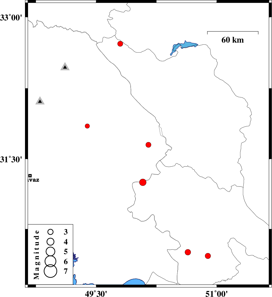 | 2007/06/17 | 20:17:51.1 | 23:47:51.1 | 31.85 | 49.39 | 45 | ML:2.6 | 11 km Masjed Soleyman, Khoozestan Province | ||