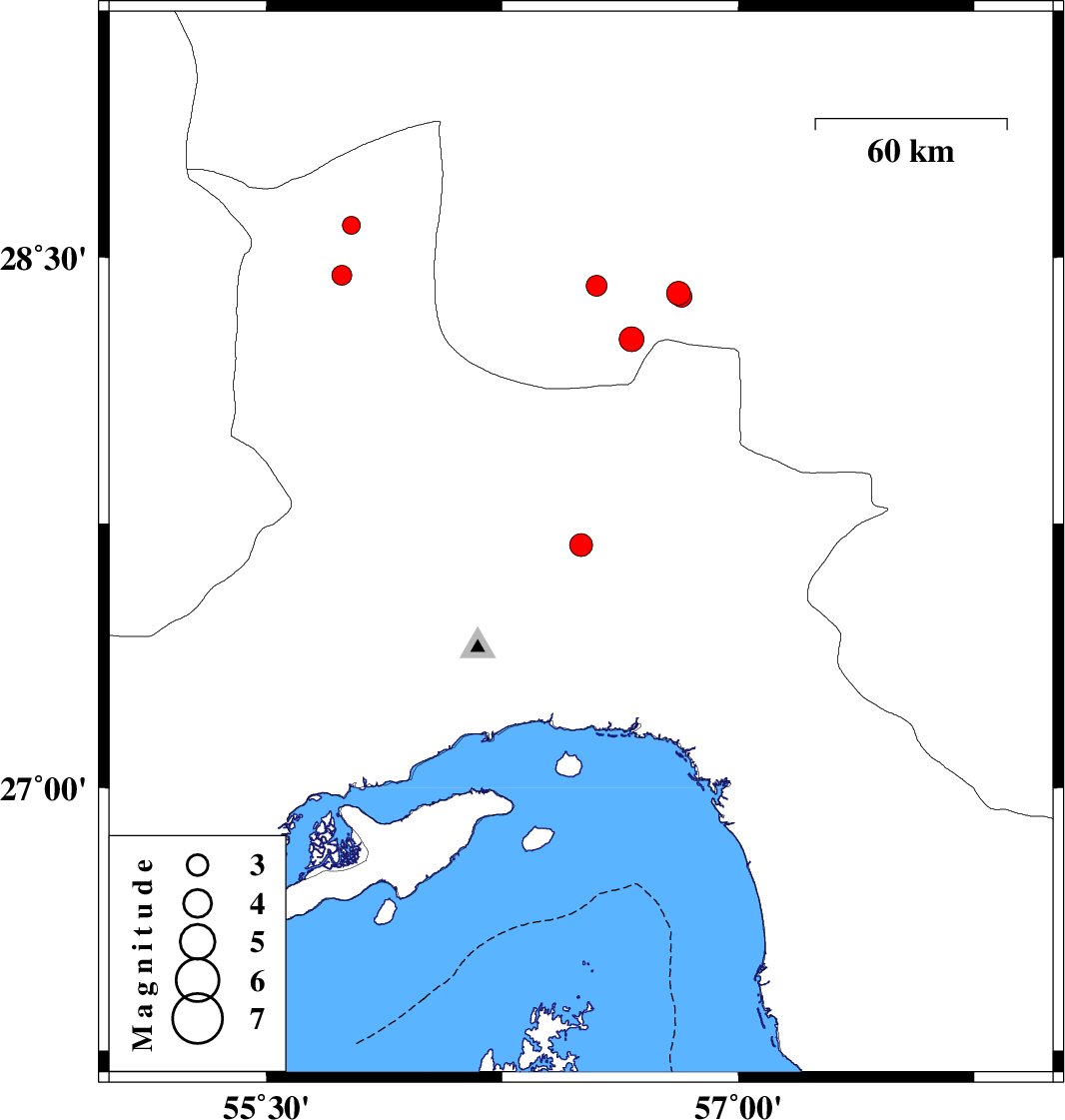 | 2007/09/11 | 12:08:12.7 | 15:38:12.7 | 28.59 | 55.77 | 15 | ML:2.6 | 34 km North-West of Hajiabad, Hormozgan Province | ||