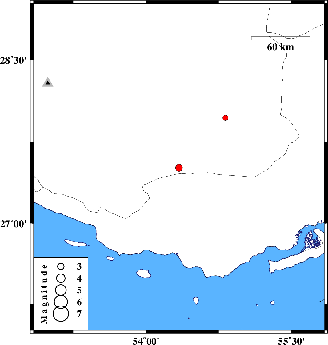 | 2007/07/12 | 00:23:30.6 | 03:53:30.6 | 27.97 | 54.82 | 14 | ML:2.5 | 57 km North-East of Lar, Fars Province |